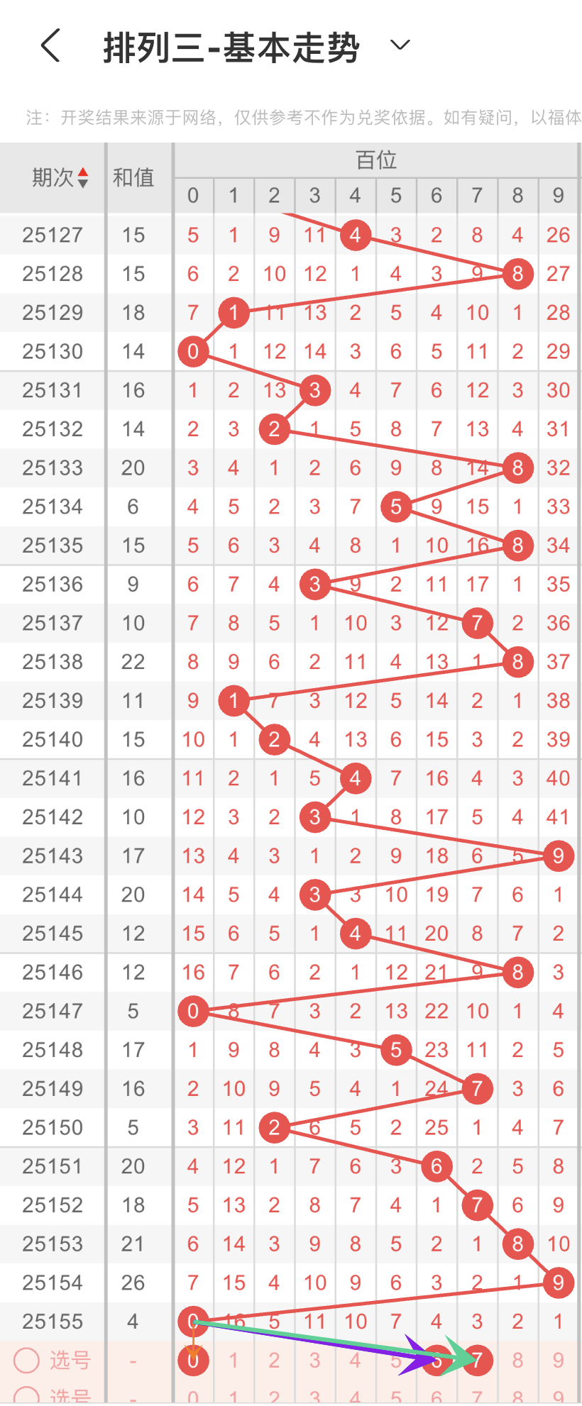 结合上面的大小、奇偶以及012路比,我们可以得到的数据分别是第一组56789,第2组02468,第3组0369,我们重点选择3组数据中重复的,那百位我们选择6,防1路的7,0路的0,综上所述百位选067