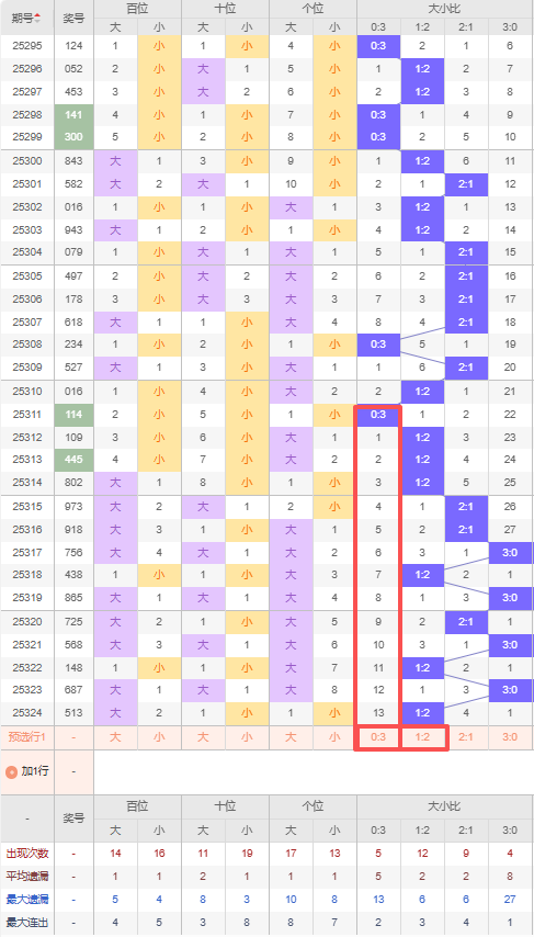上期大小比:1:2,近10期大小比出现情况:2:1、2:1、3:0、1:2、3:0、2:1、3:0、1:2、3:0、1:2,最近10期出3期2:1,出现3期1:2,出现0期0:3,出现4期3:0,根据近10期出号规律本期推荐遗漏13期的0:3,防连出1:2,综上所述大小比推荐:防:1:2,重点关注:0:3。