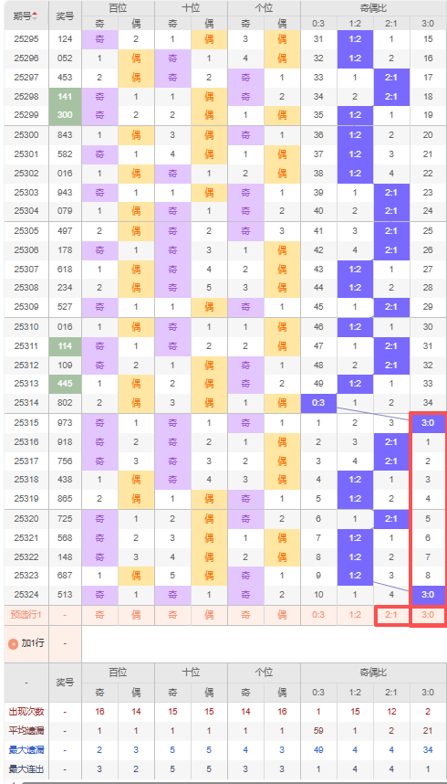 上期奇偶比:3:0,近10期奇偶比出现情况:3:0、2:1、2:1、1:2、1:2、2:1、1:2、1:2、1:2、3:0,最近10期出现3期2:1,出现5期1:2,出现0期0:3,出现2期3:0,根据近10期出号规律本期推荐遗漏4期出2:1,防连出3:0,综上所述奇偶比推荐:防:3:0,重点关注:2:1。