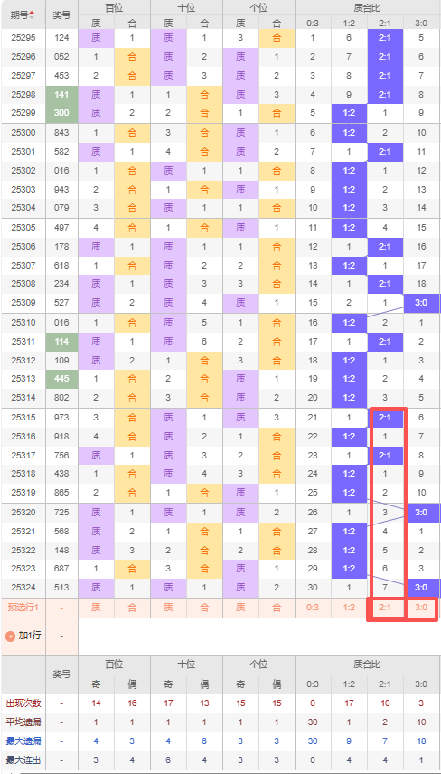 上期质合比:3:0,近10期质合比出现情况:2:1、1:2、2:1、1:2、1:2、3:0、1:2、1:2、1:2、3:0,最近10期出现2期2:1,出现6期1:2,出现0期0:3,出现2期3:0,根据近10期规律本期推荐连出3:0,防遗漏7期的2:1,综上所述质合比推荐:防:2:1,重点关注:3:0。