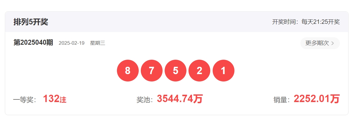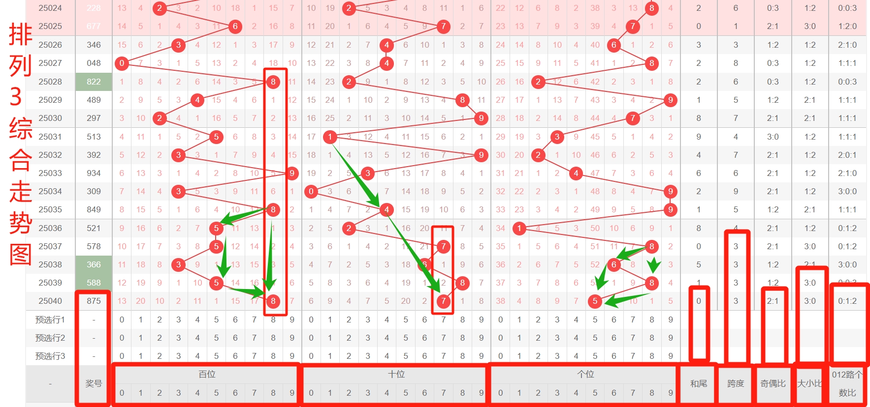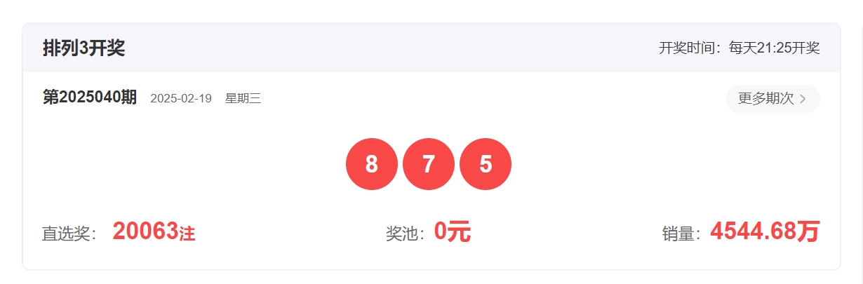 体彩排列3第2025040开奖号码为875,形态为组,奇偶比21和值20,跨度3,大小比30,【012】路个数比012