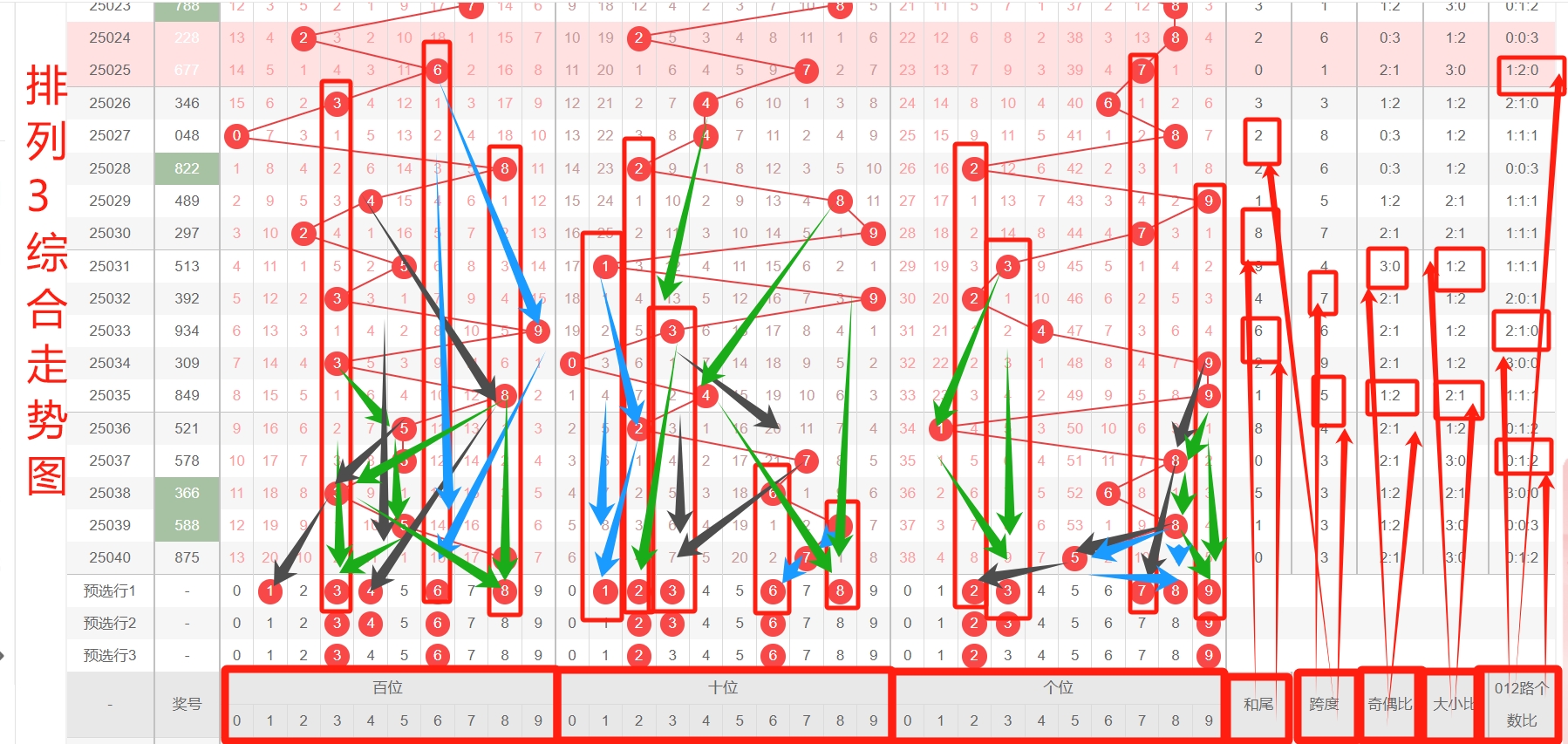 上期百位开出数号码【8】,近十五期百位开出号码为:【3-0-8-4-2-5-3-9-3-8-5-5-3-5-8】,开出奇偶比是:【奇偶偶偶偶奇奇奇奇偶奇奇奇偶】的态势,连续期开出奇数号码后开出偶数号码,近十五期开出8:7的奇偶比,从比例看数占优势,奇偶比处于基本平衡之势,大小比为:【小小大小小大小大小大大大小大】的态势,开出大号号码,大小比为69,大号占据优势,处于失衡之势,百位开出跨度3,开出跨。结合上图综合走势看,上期开出号码【8】,奇偶比处于基本平衡之势,从近几期看,本期开出小号的概率要大一些,选号时可重点关注中下部号段的小号号码为主,防大号号码。本期主要以偶数为主,防奇数号码,看好稍微小一点跨度的号码,也可以考虑重号号码。