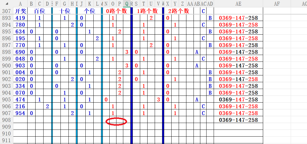 如上图56,012路分析0路出号的概率还是很大,本期可以0路号入手做胆0369中选;看好369胆码