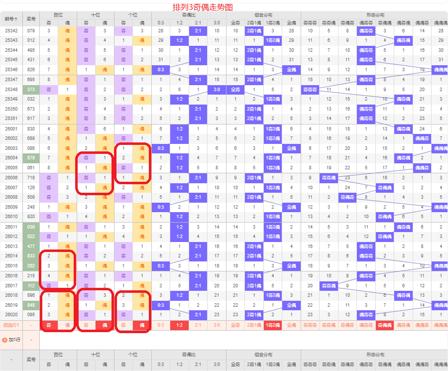 上一期的奇偶比为2:1,两奇的号码组合,从近五期的奇偶数出现情况看,奇数出7次,偶数出现8次,奇数偶数号码出现较平均,本期要侧重两偶的号码组合,侧重奇偶偶或奇奇偶的号码组合,根据奇偶组合形态可做五码定位13579/02468/02468或13579/13579/02468