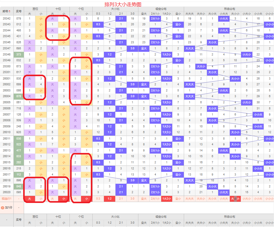 上一期大小比为2:1,俩大的号码组合,近五期大号出8次,小号出7次,大小号码出现较平均,上一期是两大的号码组合,本期侧重两小的号码组合,百位侧重大号码,十位侧重小号码,个位侧重小号码,侧重大小小或者大小大的号码组合,根据大小形态五码定位56789/01234/01234或者56789/01234/56789