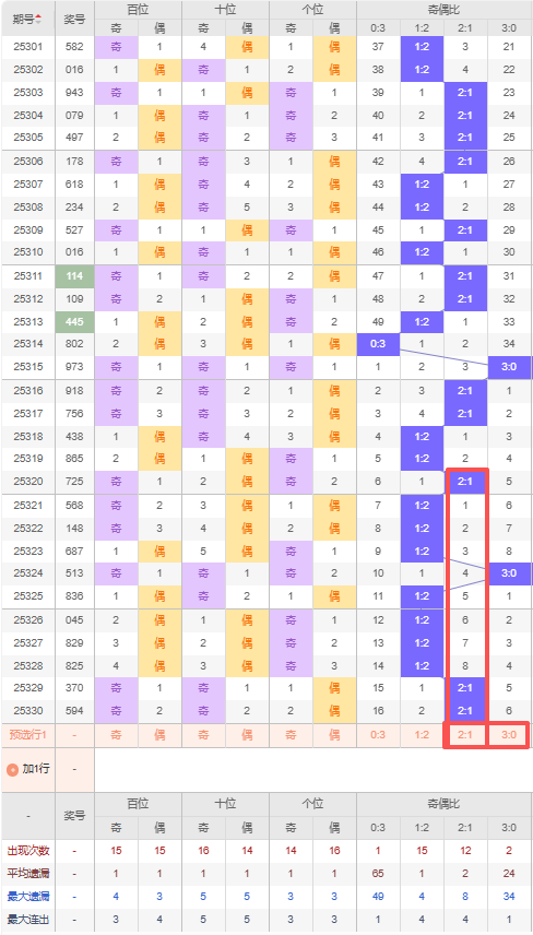 上期奇偶比:2:1,近10期奇偶比出现情况:1:2、1:2、1:2、3:0、1:2、1:2、1:2、1:2、2:1、2:1,最近10期出现2期2:1,出现7期1:2,出现0期0:3,出现1期3:0,根据近10期出号规律本期推荐三连出2:1,防遗漏6期出3:0,综上所述奇偶比推荐:防:3:0,重点关注:2:1。