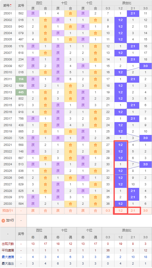 上期质合比:1:2,近10期质合比出现情况:1:2、1:2、1:2、3:0、1:2、1:2、1:2、2:1、2:1、1:2,最近10期出现2期2:1,出现7期1:2,出现0期0:3,出现1期3:0,根据近10期规律本期推荐隔期出2:1,防连出的1:2,综上所述质合比推荐:防:1:2,重点关注:2:1
