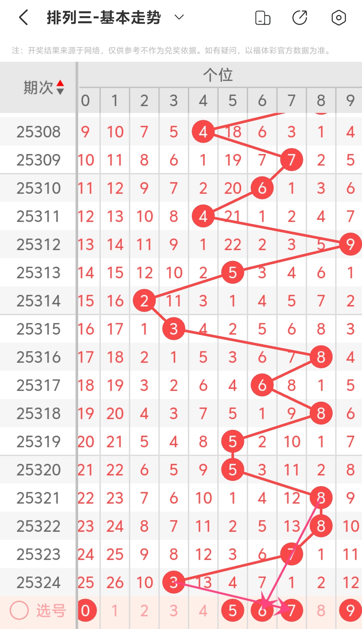 上期个位开出3,本区与上期的跨度为4,本期我们可以从上面走势图中看出选号的思路,6为斜连走势跨度为三,7为隔期回补走势跨度为四,综合以上分析,本期个位推荐:05679