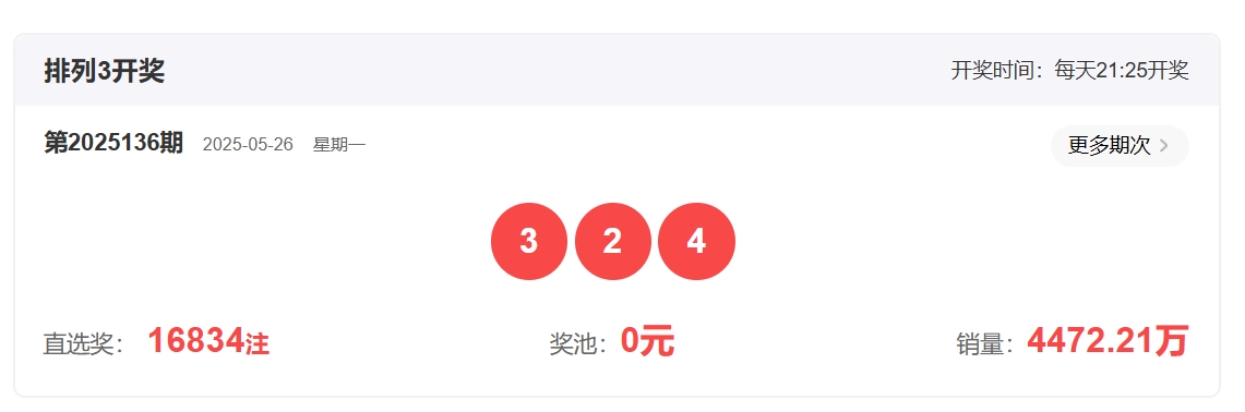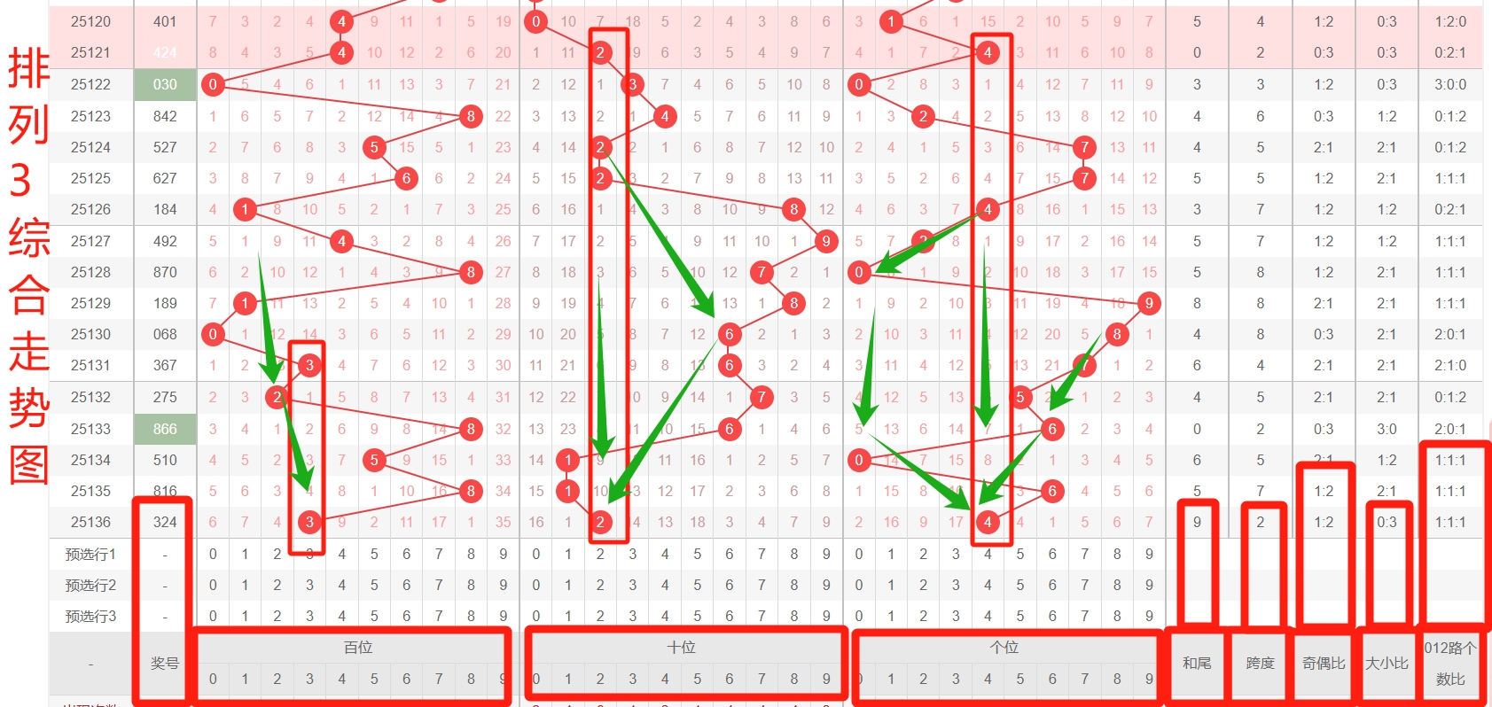 体彩排列3第20250136开奖号码为324,形态为组六,奇偶比1:2,和值9,跨度2,大小比0:3,【012】路个数比1:1:1。