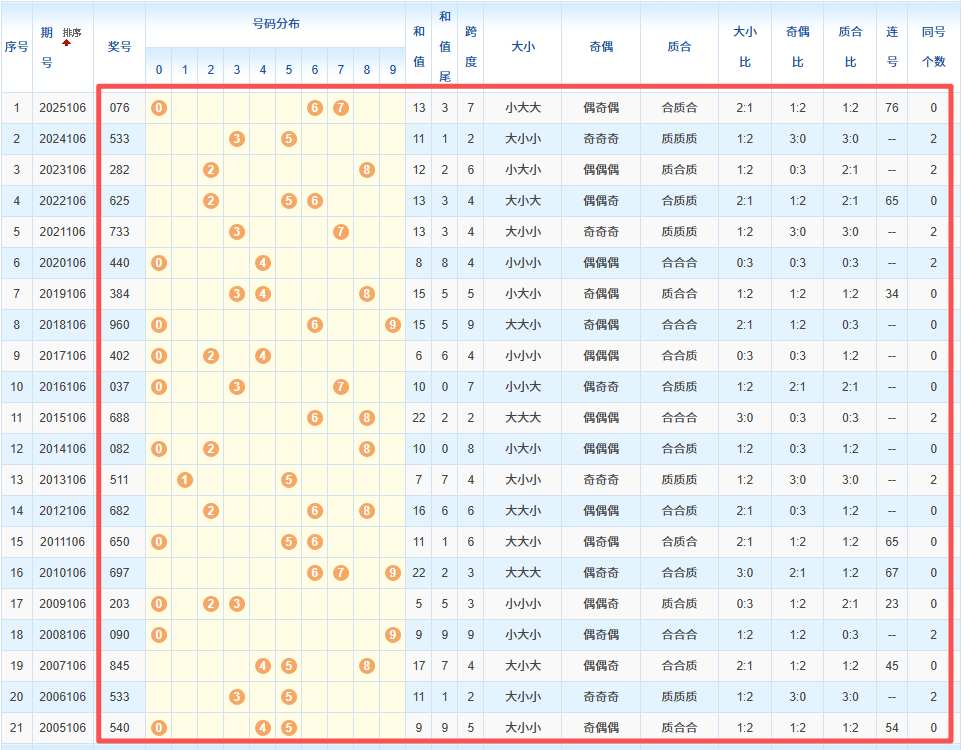 1、统计往年同期开奖号码