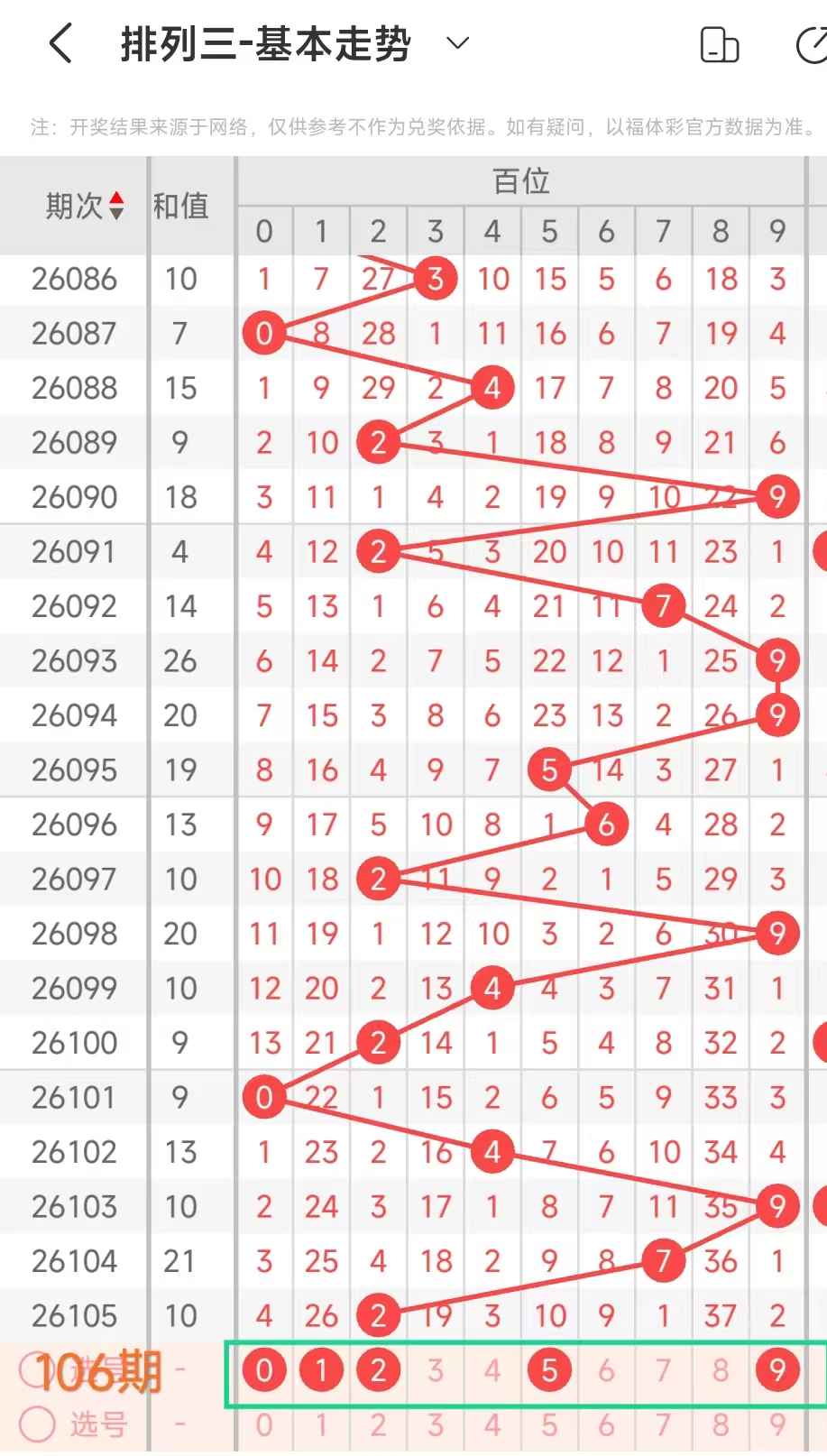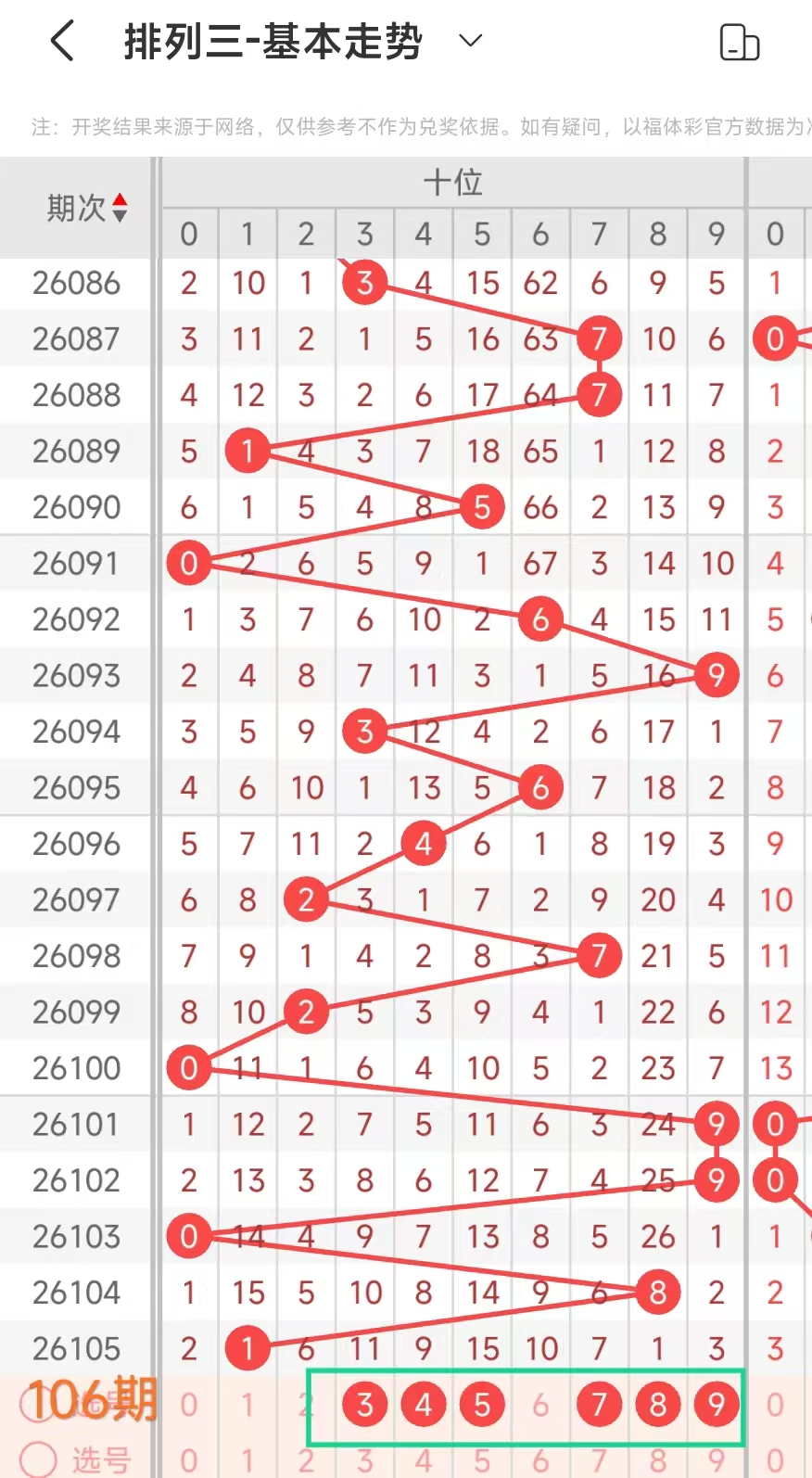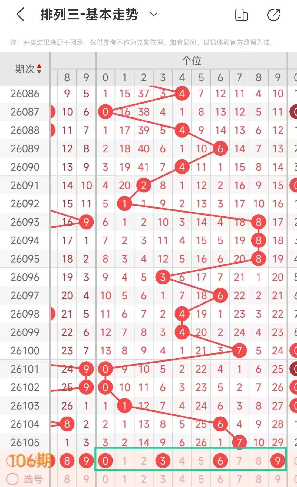 经统计0号出现10次、1号出现1次、2号出现6次、3号出现6次、4号出现5次、5号出7次、6号出现7次、7号出4次、8号出现6次、9号出现3次.统计后出现次数靠前的数字作为我们的备选号码.其号码有023568等