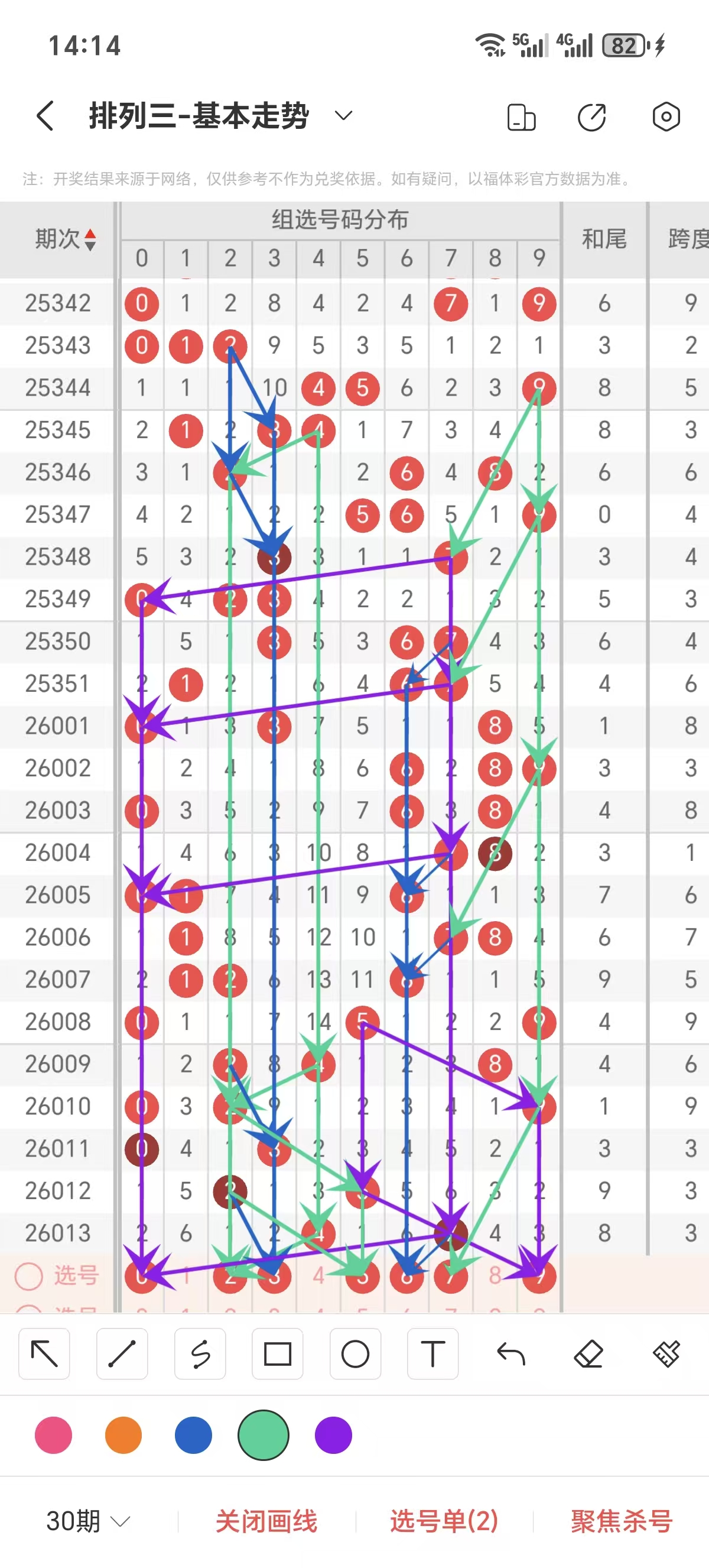 通常情况下在五期之内重复一个跨度的概率较高,近五期重复了3的跨度,近五期跨度为6/9/3/3/3,近期0路的跨度较热,本期要侧重4/6/7跨为主的号码组合。选择好跨度就可以从跨度方面选择相应的双胆码组合,双胆码的选取要根据近期和历史的走势进一步的分析选取。