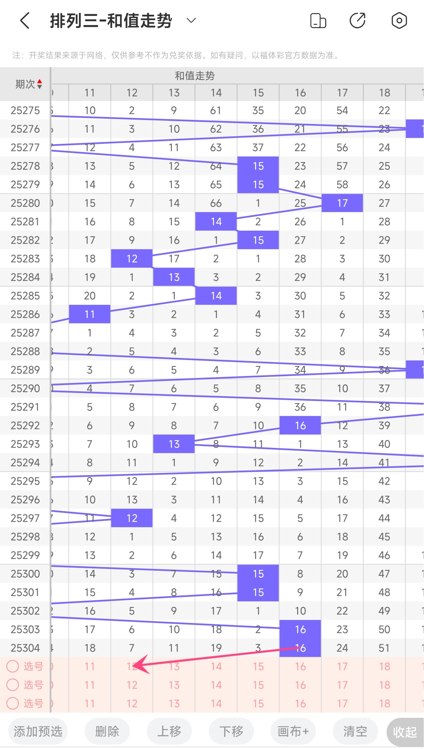 上期和值为16,往前一期和值为16,趋势没有移动,偏移量为9。通过走势图分析,16和值是近30期内开出的中间偏大一点的和值,上升空间和下降空间差不多。所以趋势是可能往左也可能往右。本期看好小和值,因此推测本期趋势是往左的,和值会变小,小概率继续往右,和值变大。