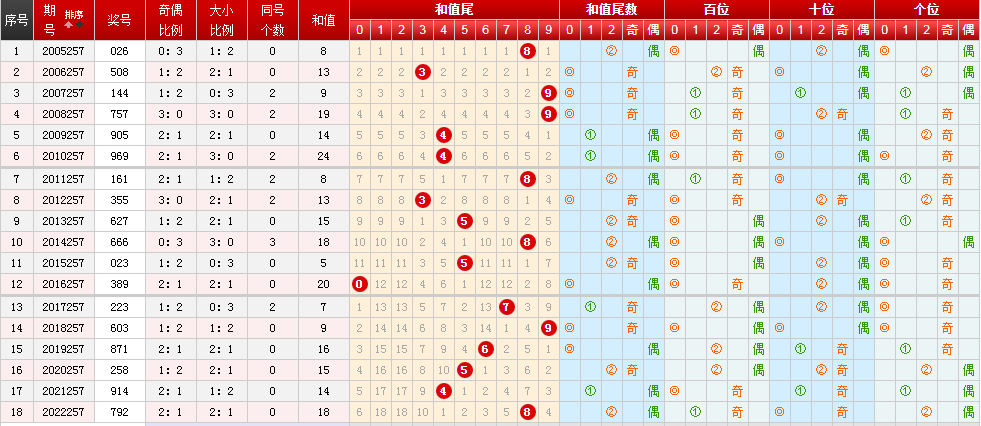本期分析预测前,我们先来看看排列3-257期的历史同期开奖号码及基本参数特征图(如下图)
