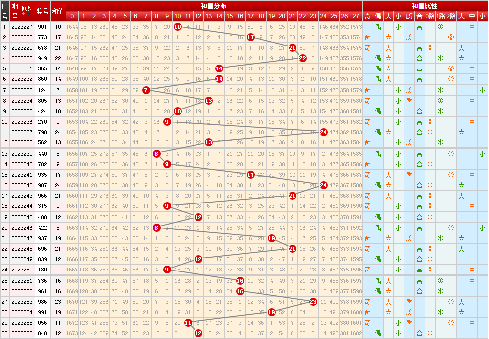 我们来看看排列3最近三十期开奖号码的和值分布及属性