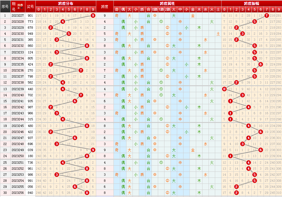 我们来看看排列3最近三十期开奖号码的跨度分布及属性