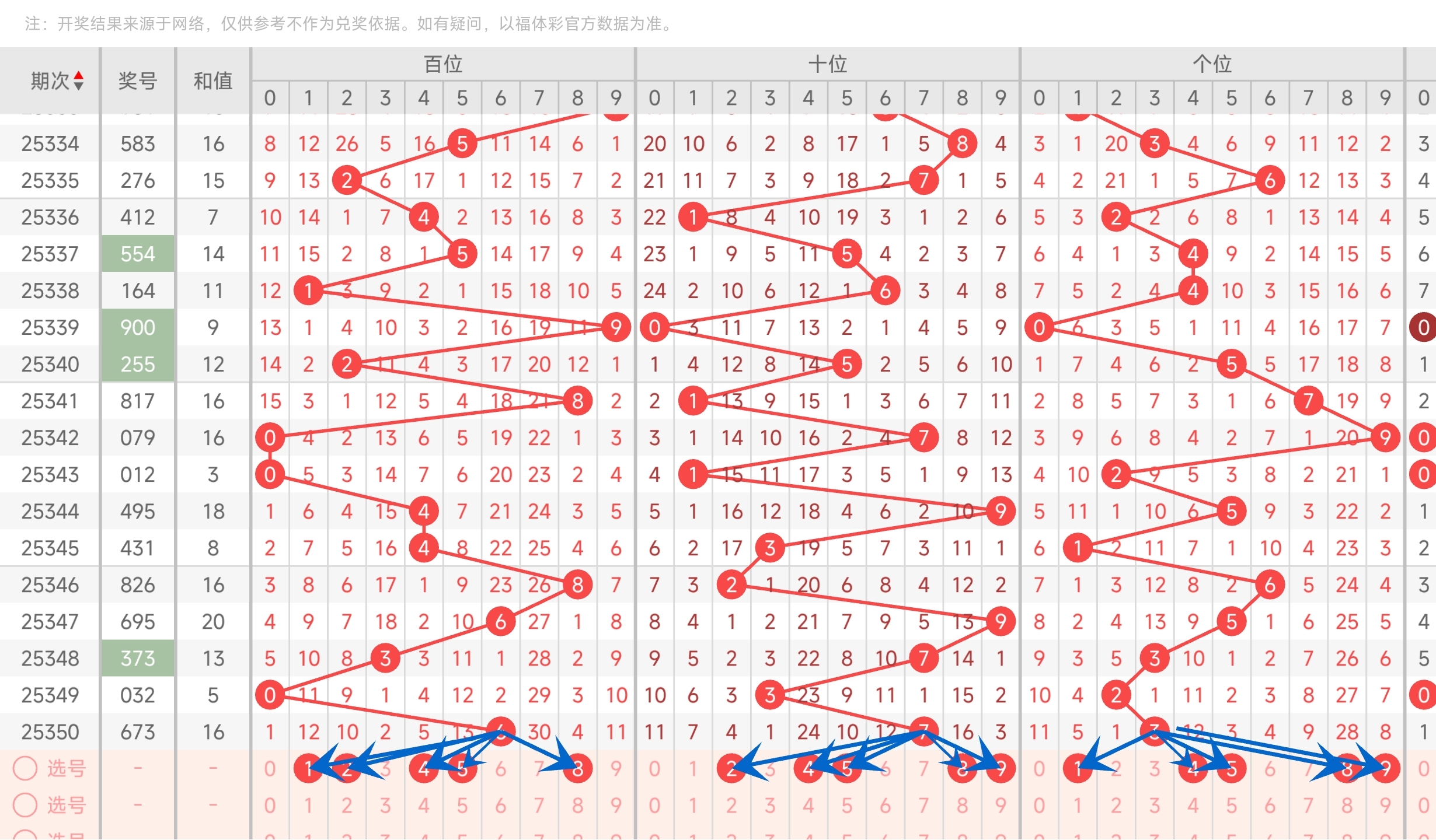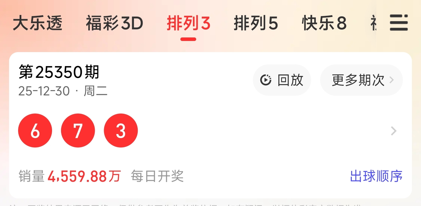 上期排列3开出673,和尾为6,跨度为4,奇偶比为2:1,大小比为2:1,012路个数对比为2:1:0。