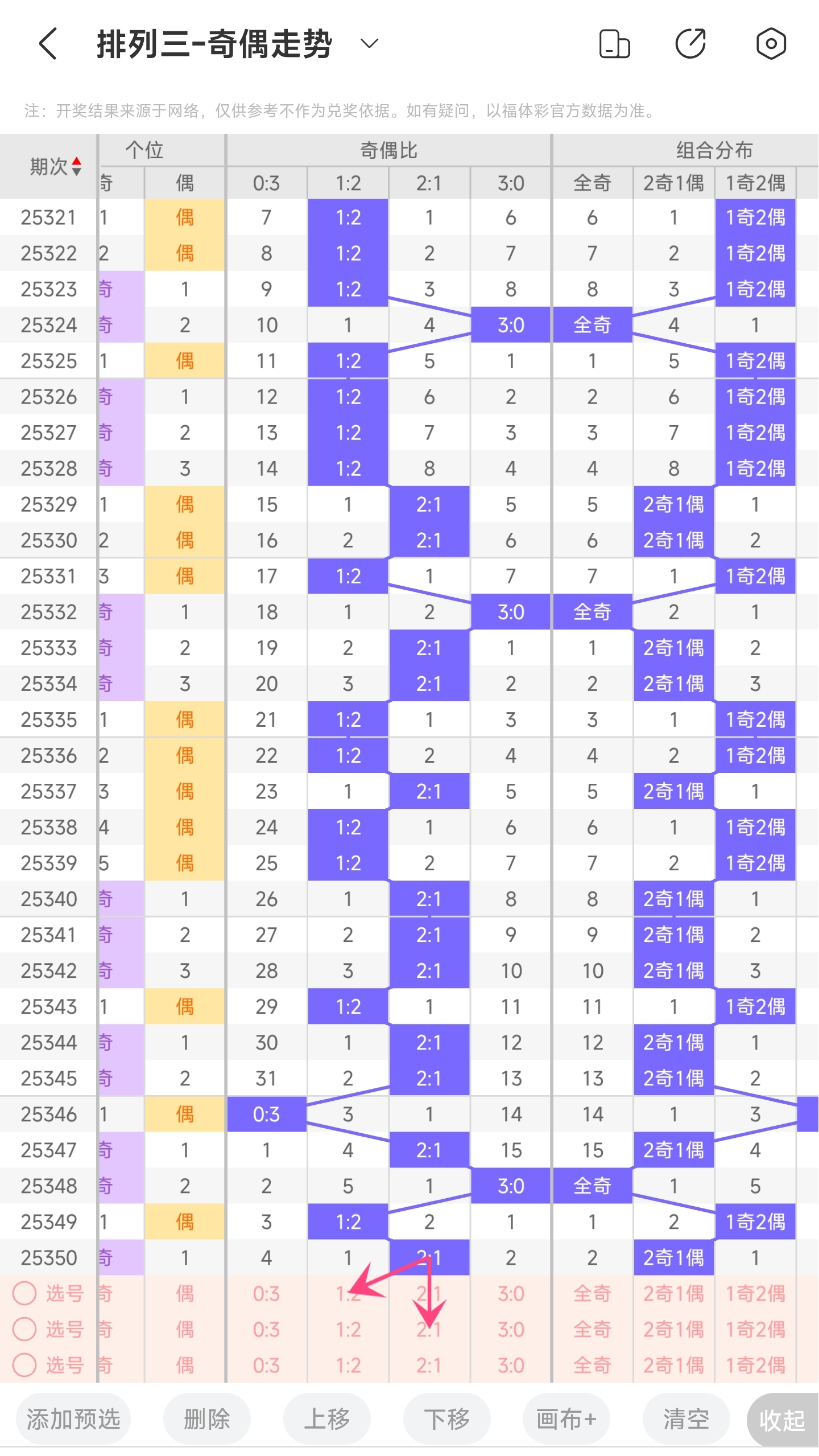 上期开出了2:1的奇偶比。往前一期是1:2奇偶比。通过分析奇偶走势图,近30期内开出1:2奇偶比的次数是14次,开出2:1奇偶比的次数是12次,3:0是3次,0:3是1次。和前一期相比,次数没有发生变化。通过走势图分析,可以看到上期开了2:1,本期比较看好2:1奇偶比。所以推测本期可能开2:1奇偶比,其次是1:2奇偶比,最后是3:0或者0:3奇偶比。