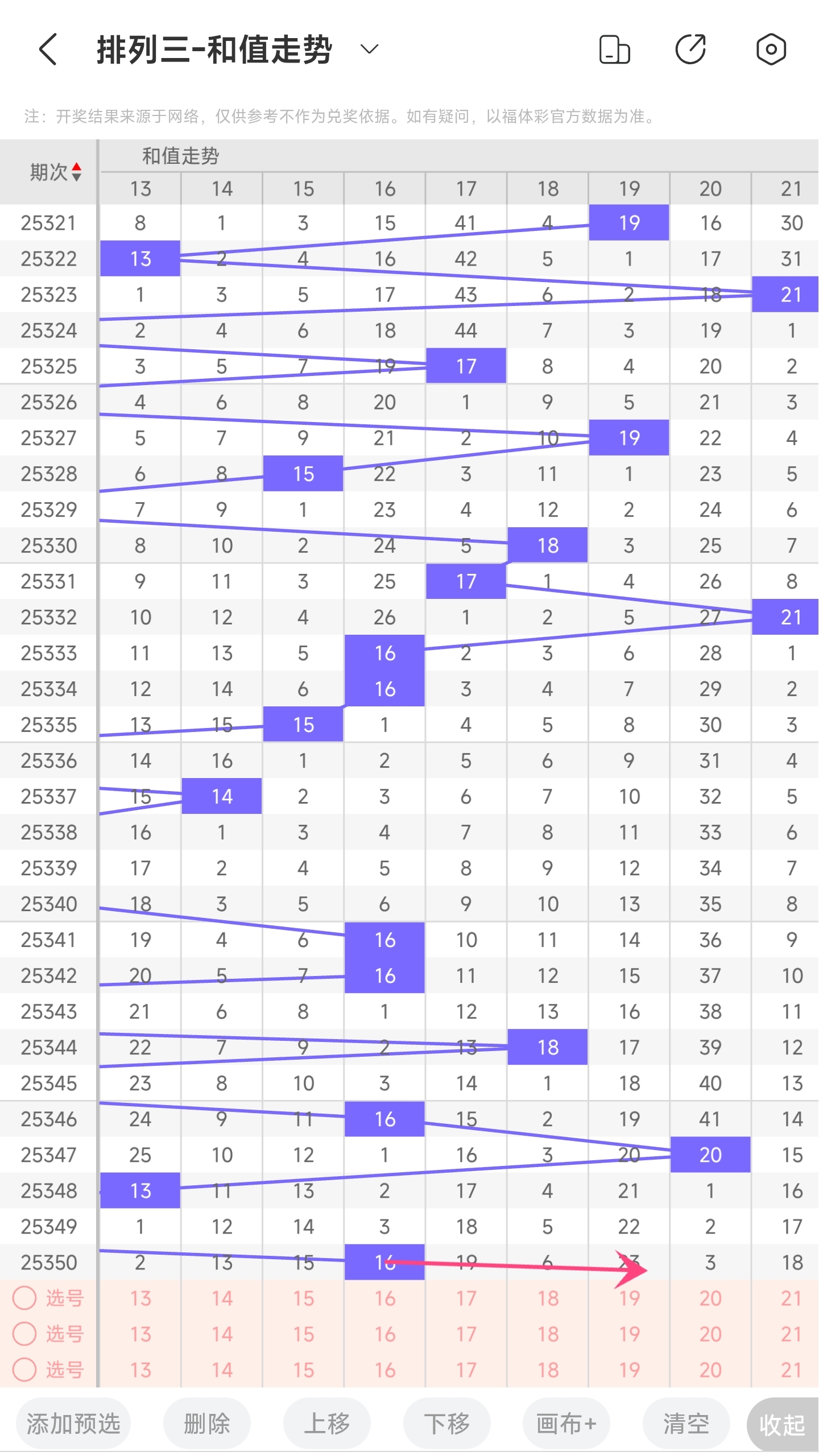 上期和值为16,往前一期和值为5,趋势往右移动,偏移量为11。通过走势图分析,16和值是近30期内开出中间的和值,下降空间和上升空间差不多。本期看好和值变大,因此推测本期趋势是往右的,和值会变大,小概率往左,和值变小。