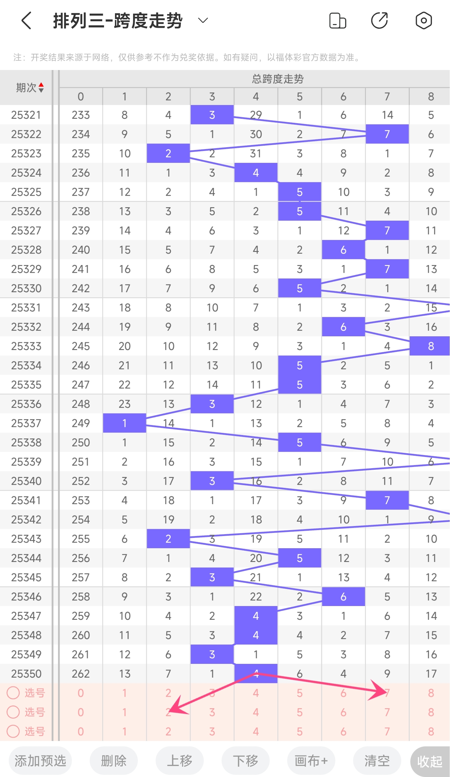 上期跨度为4,往前一期跨度是3,趋势往右移动,偏移量为1。跨度值4时,跨度值是近30期内开出比较小的值。通过走势图分析,目前的趋势是大概率往右,小概率往左。所以推测本期跨度可能为25678等跨度。