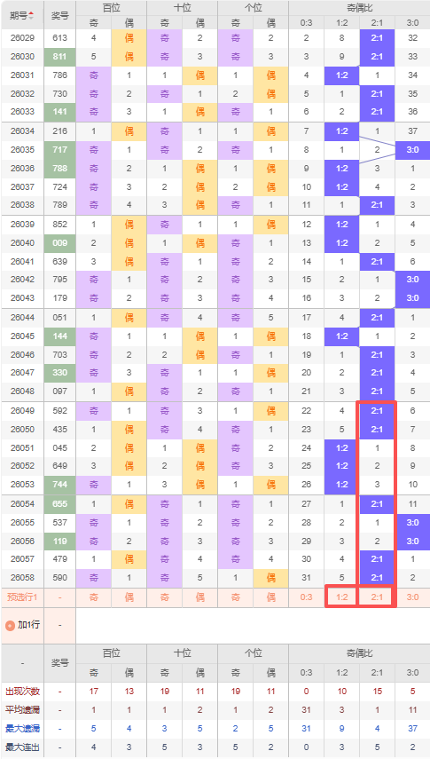 上期奇偶比:2:1,近10期奇偶比出现情况:2:1、2:1、1:2、1:2、1:2、2:1、3:0、3:0、2:1、2:1,最近10期出现5期2:1,出现3期1:2,出现0期0:3,出现2期3:0,根据近10期出号规律本期推荐三连出2:1,防遗漏5期出1:2,综上所述奇偶比推荐:防:1:2,重点关注:2:1。