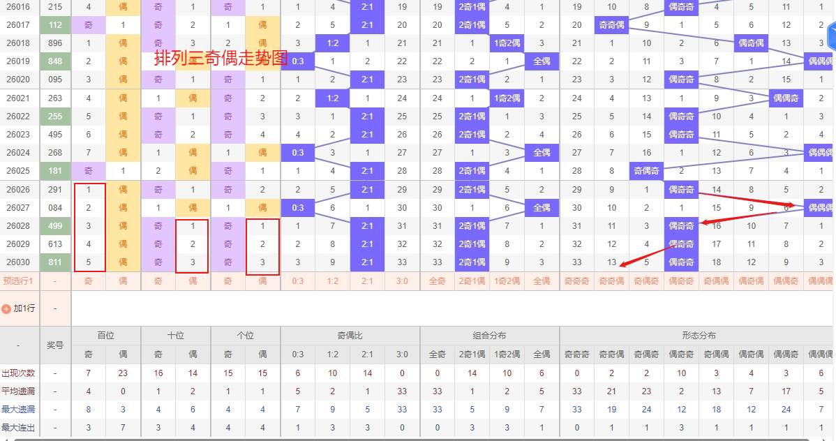 排列三 奇偶分析:从上图可以看出排列三100期内百位奇偶比约为49比51,十位奇偶比为47比53,个位奇偶比为54比46,百位的比值比较均衡,但是个位的比值偏差就有点大,历史奇偶形态近2期开出偶奇奇后下一期的走势为,第304期开出偶奇奇后305期开偶奇偶, 第317期开出偶奇奇后第318期开奇奇奇,第326期开出偶奇奇后第327期开奇奇偶,近期排列三奇偶走势来看,“偶奇偶”组合表现强势,持续热出,短期内形成明确的趋势性热点,后续仍有延续的可能,需持续关注其惯性走势。与此同时,“奇奇奇”组合已进入较长的遗漏周期,冷态特征显著,根据奇偶组合的均衡回补规律,全奇组合在长期冷寂后往往具备较强的回补潜力,近期需重点防范其解冻反弹,可视为一个值得布局的防守方向。所以排列三2026031期偶奇偶形态推偶奇偶与奇奇奇。