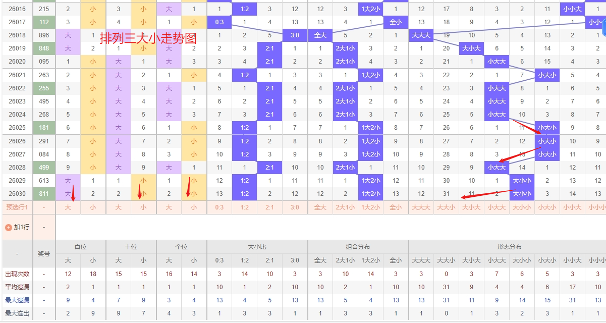 排列三 大小形态分析:从大小走势图上可以看出排列三100期内百位大小比约为49比51,十位大小比约为46:54,个位大小比约为55比45,除了个位奇数比偶数多,十位和百位偶数比奇数多。历史数据近2期开出大小小下一期的走势为,第307期开出大小小第308期开小小小。第314期开出大小小后第315期开大大小,第322期开出大小小后323期开小大大。近期排列三大小走势分析,“大大小”组合已进入较深的冷态区间,遗漏周期不断拉长,按照大小组合通常的均衡特性,此类冷态组合在经历长期蛰伏后,其回补动能正逐步累积,近期出现反弹解冻的可能性较高,值得作为重点防守对象进行关注。另一方面,“小小小”组合近期表现为温态偏暖,出现频次有所回升,走势上显示出逐渐转热的迹象,需警惕其热度持续上升并形成短期热点,所以排列三第2026031期大小形态推荐大大小防小小小。