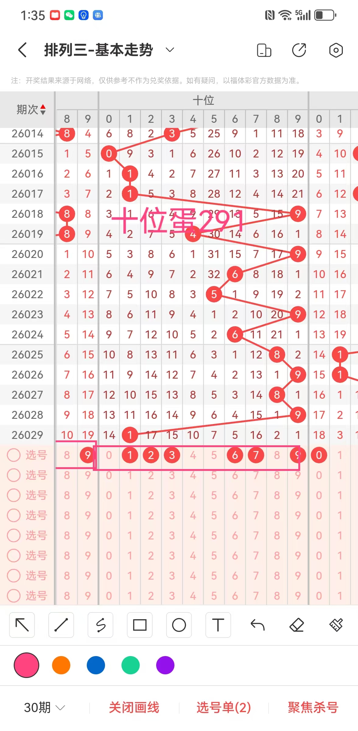 ②十位大小比:近5期大小比3:2,大号依次开出为:788, 大号中奇偶比,1:2,小号依次开出31,小号中奇偶比2:0,通过对比分析得出(1356789)有可能开其一