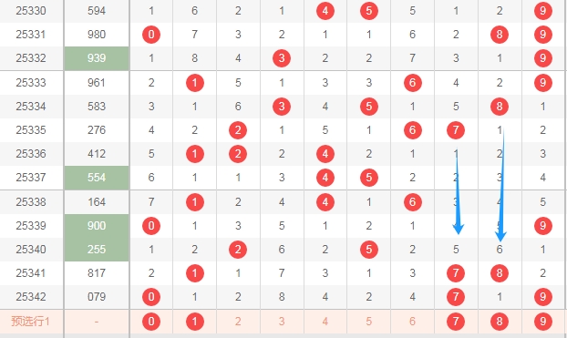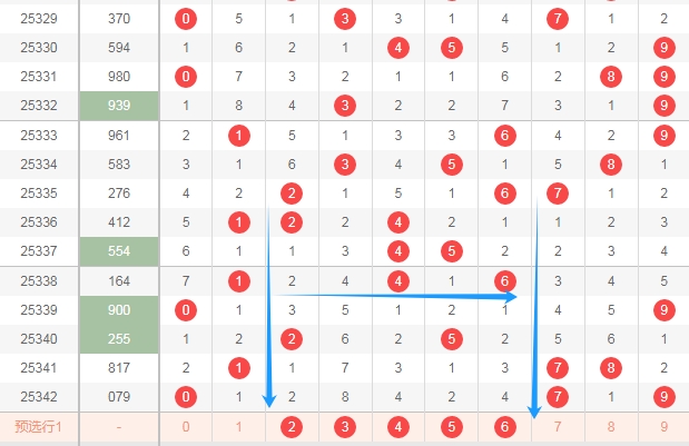 上图是体彩排列三开奖号码分布走势图,我在上面图 中标注的蓝色箭头表示是区域,你们看看上面我标注出来的区域这些数字2 3 4 5 6会发现这几个数字最近四期只出现了两个数字,而且是第2025340期出现了两个数字,那么本期这个区域的号码个人可以关注出2个或者3个,也就是关注数字2 3 4 5 6出2个或者3个。