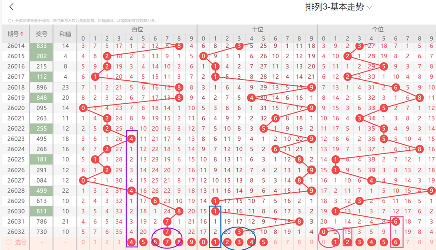上一期百位开出号码为7,为奇数、大数、质数、1路号码:近10期百位较少开出03等号码,本期百位大概率仍然不会开出03等号码,因此本期百位选号时应该优先排除03等号码,结合上述走势图看,本期百位看好456789等号码。