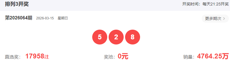 2026064期体彩排列三开出奖号528,属性为组六。结合最近10期类型走势规律(如图标记),下期开出组三形态的概率较高、同时需要防守组六