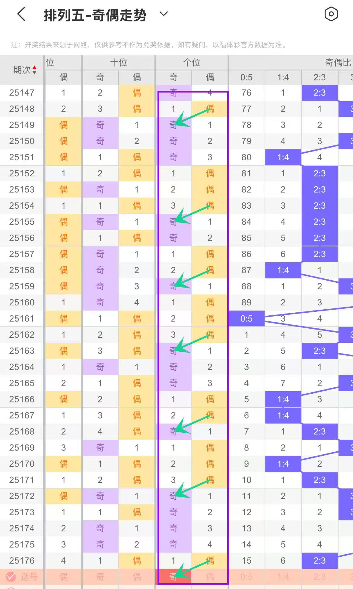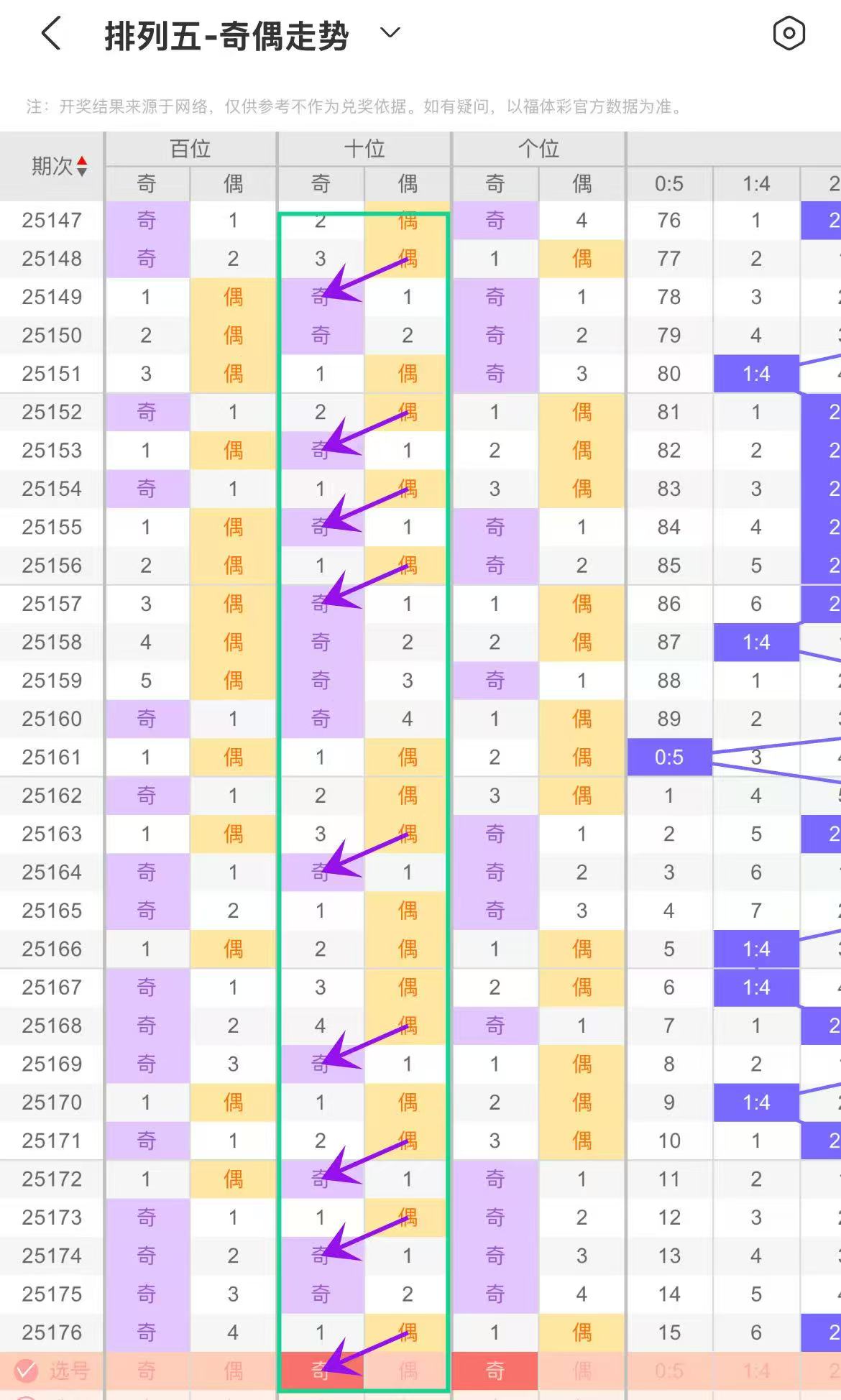 根据上图排列五十位奇偶形态走势分析,偶态长期占据主导,偶态连出后,奇态以箭头回补。观察走势,偶态持续性强,多次形成连续出号段。奇态回补为间歇性,在偶态连出一定期数后,奇态借箭头信号补充。整体看,十位偶态主导趋势明显,奇态回补是偶态连出后的阶段性调整,可关注偶态连出周期尾声,奇态回补带来的奇偶转换时机,辅助判断十位奇偶走势节奏,本期参考回补奇数(13579)