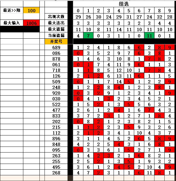 4:组选排序(近100期)开奖号组选各位0-9排序为8520496137 *首选*>>>85204 *次选*>>>96137