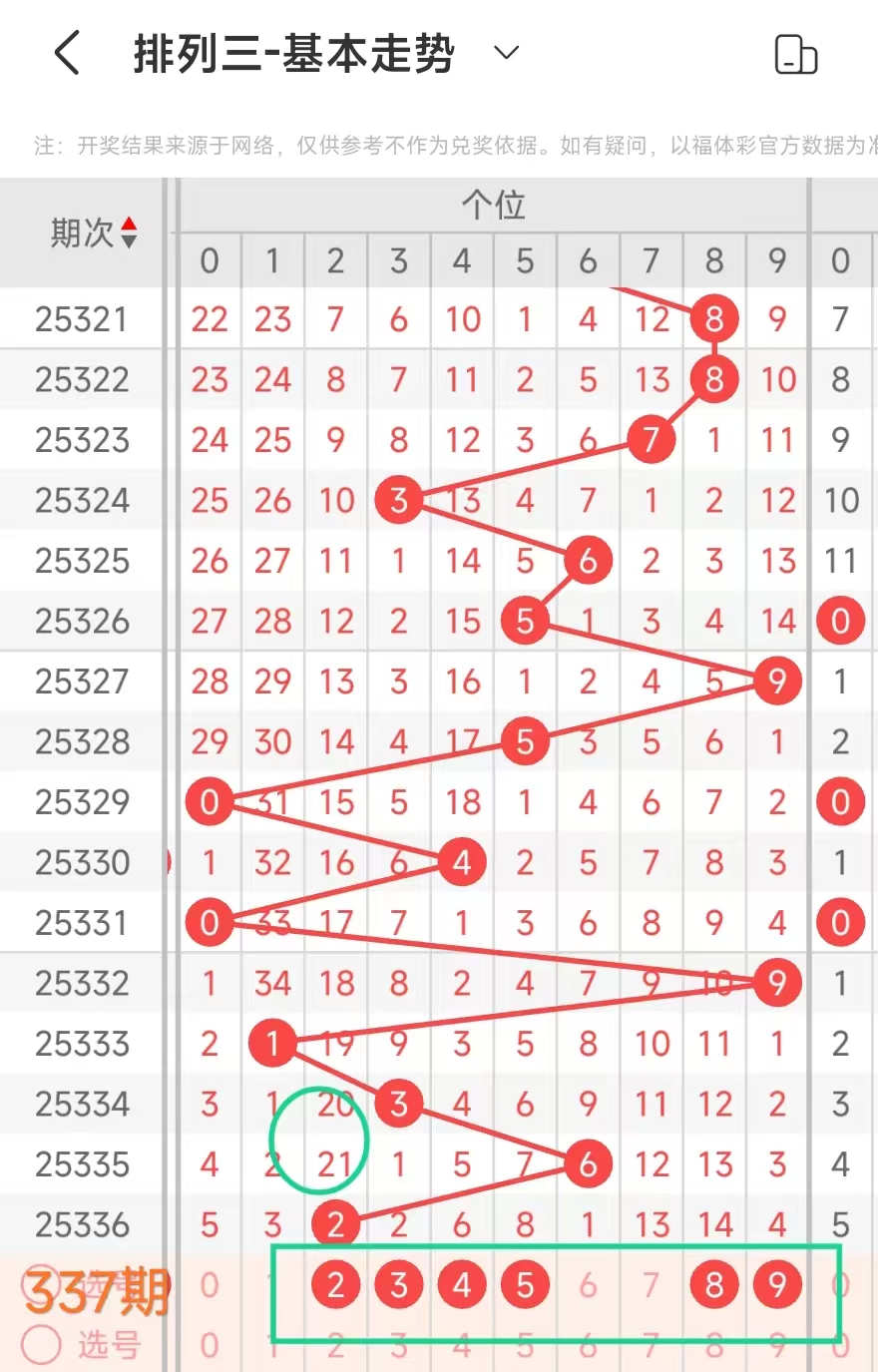 近10期开奖遗漏值分别1 29 18 1 4 34 9 9 21,奇偶属性分别为:奇奇偶奇偶偶奇奇奇,奇后可能出偶,而偶数遗漏值的有234589,本期不妨考虑一下。