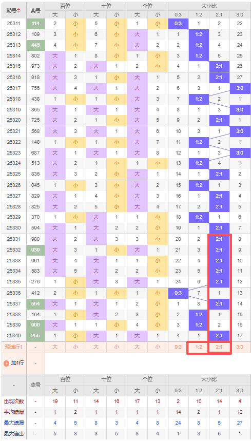 上期大小比:2:1,近10期大小比出现情况:2:1、2:1、2:1、2:1、2:1、0:3、2:1、1:2、1:2、2:1,最近10期出7期2:1,出现2期1:2,出现1期0:3,出现0期3:0,根据近10期出号规律本期推荐隔期出1:2,防连出2:1,综上所述大小比推荐:防:2:1,重点关注:1:2。