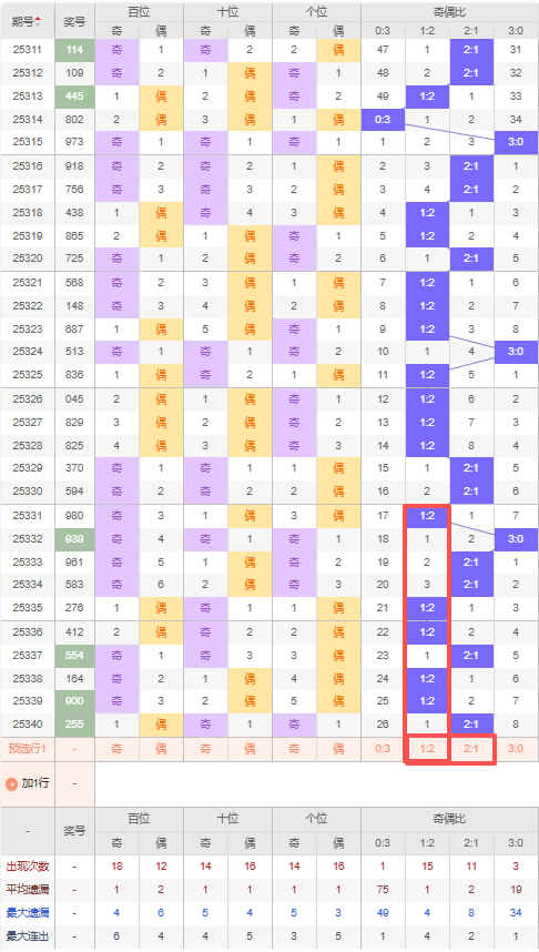 上期奇偶比:2:1,近10期奇偶比出现情况:1:2、3:0、2:1、2:1、1:2、1:2、2:1、1:2、1:2、2:1,最近10期出现4期2:1,出现5期1:2,出现0期0:3,出现1期3:0,根据近10期出号规律本期推荐隔期出1:2,防连出2:1,综上所述奇偶比推荐:防:2:1,重点关注:1:2。