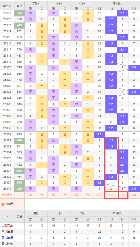 上期质合比:3:0,近10期质合比出现情况:0:3、1:2、1:2、2:1、2:1、2:1、2:1、1:2、0:3、3:0,最近10期出现4期2:1,出现3期1:2,出现2期0:3,出现1期3:0,根据近10期规律本期推荐遗漏2期的1:2,防遗漏3期的2:1,综上所述质合比推荐:防:2:1,重点关注:1:2。