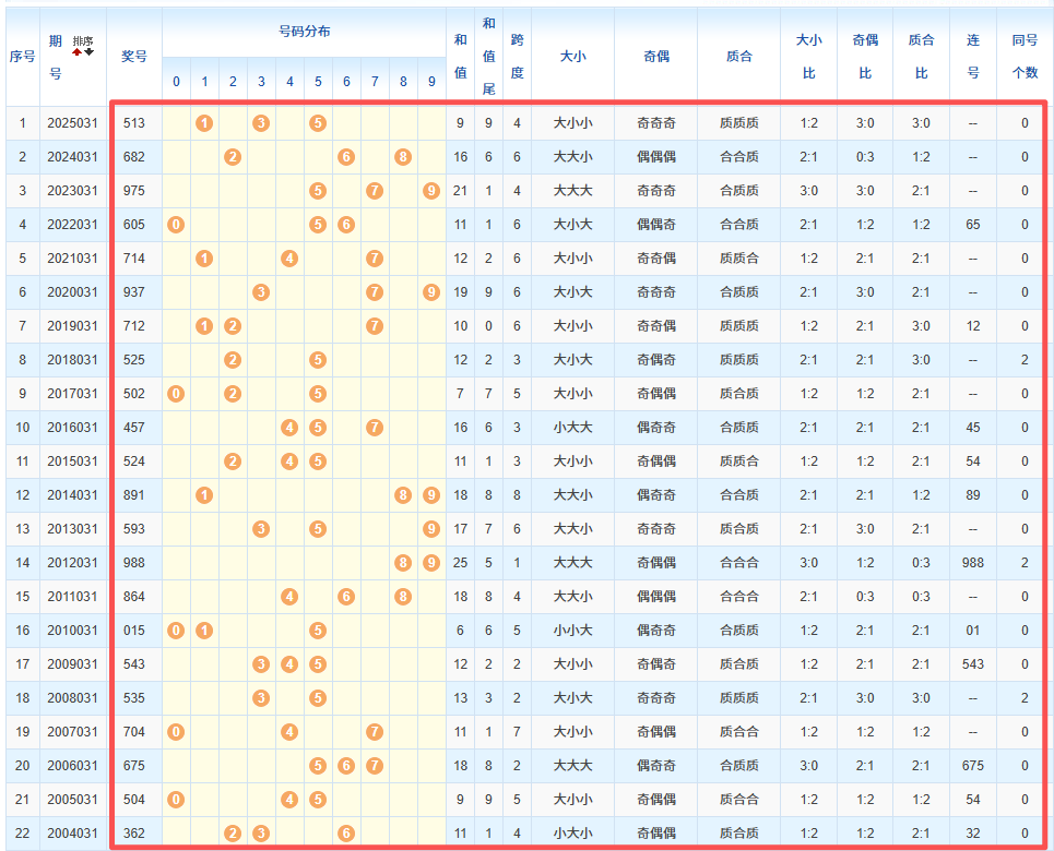 1、统计往年同期开奖号码