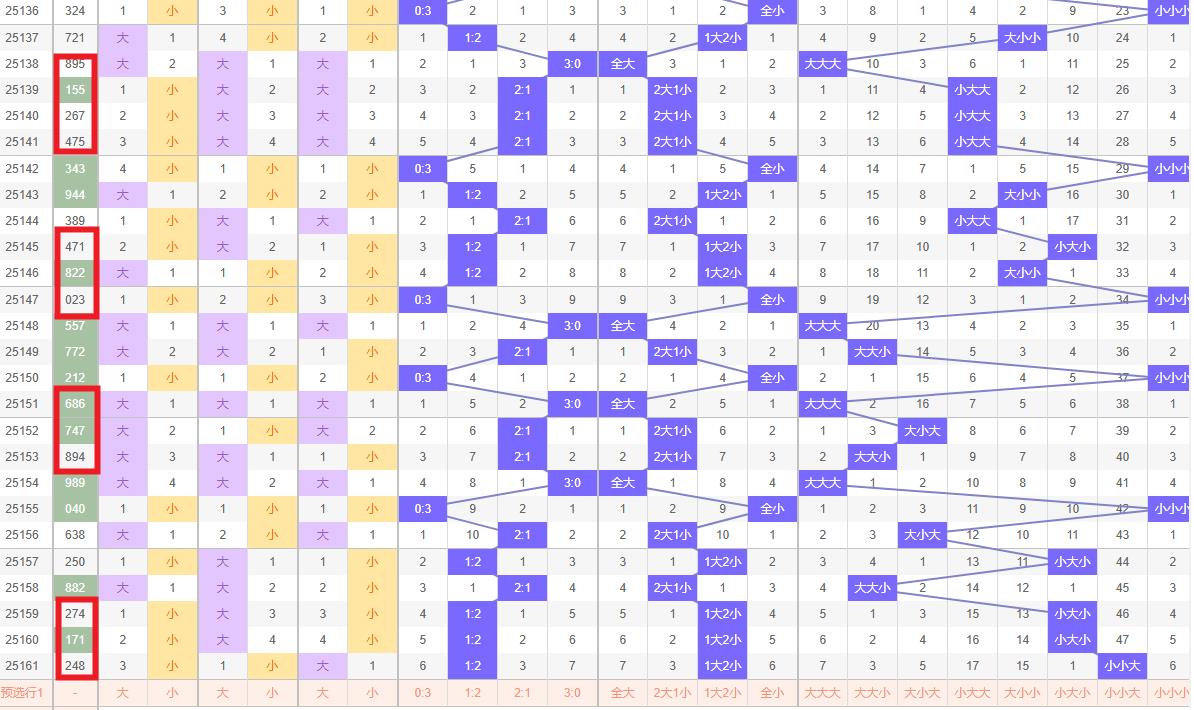 两小一大组合出现4次,两大一小组合出现4次,全大组合出现1次,全小组合出现1次,本期预计开出两大一小组合;本期形态看好组六;组三遗漏3期。