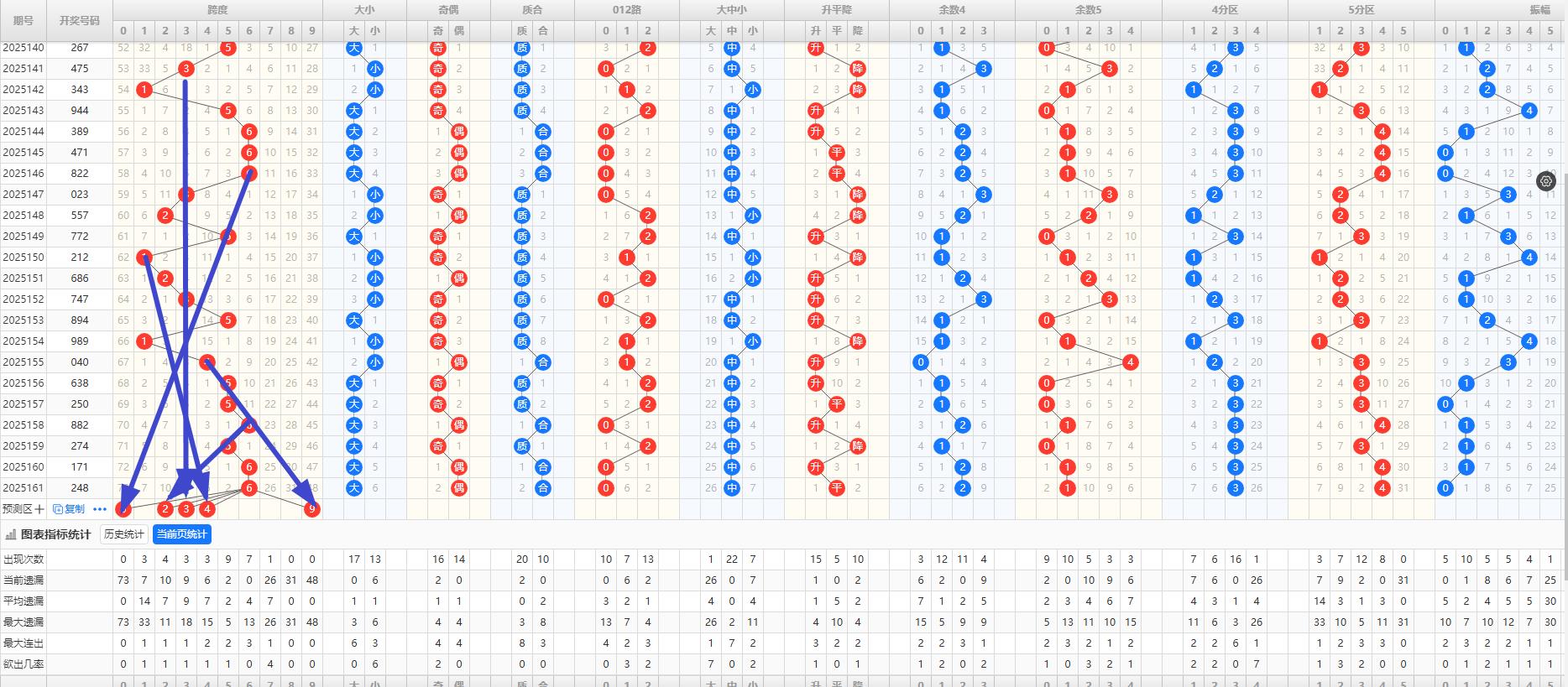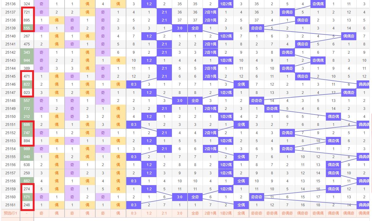 3.跨度预判分析 跨度最近10期012路比为4:2:4,012路跨度开出0路和2路占优,最近5期奖号跨度出现在2-4区段,波动了2个点位,比较集中,上期跨度为2,下降了1点,本期看好考跨度下降,预计出现2、3、4、5、6。