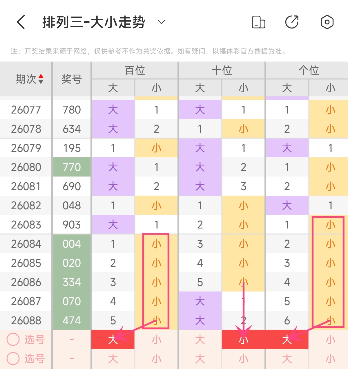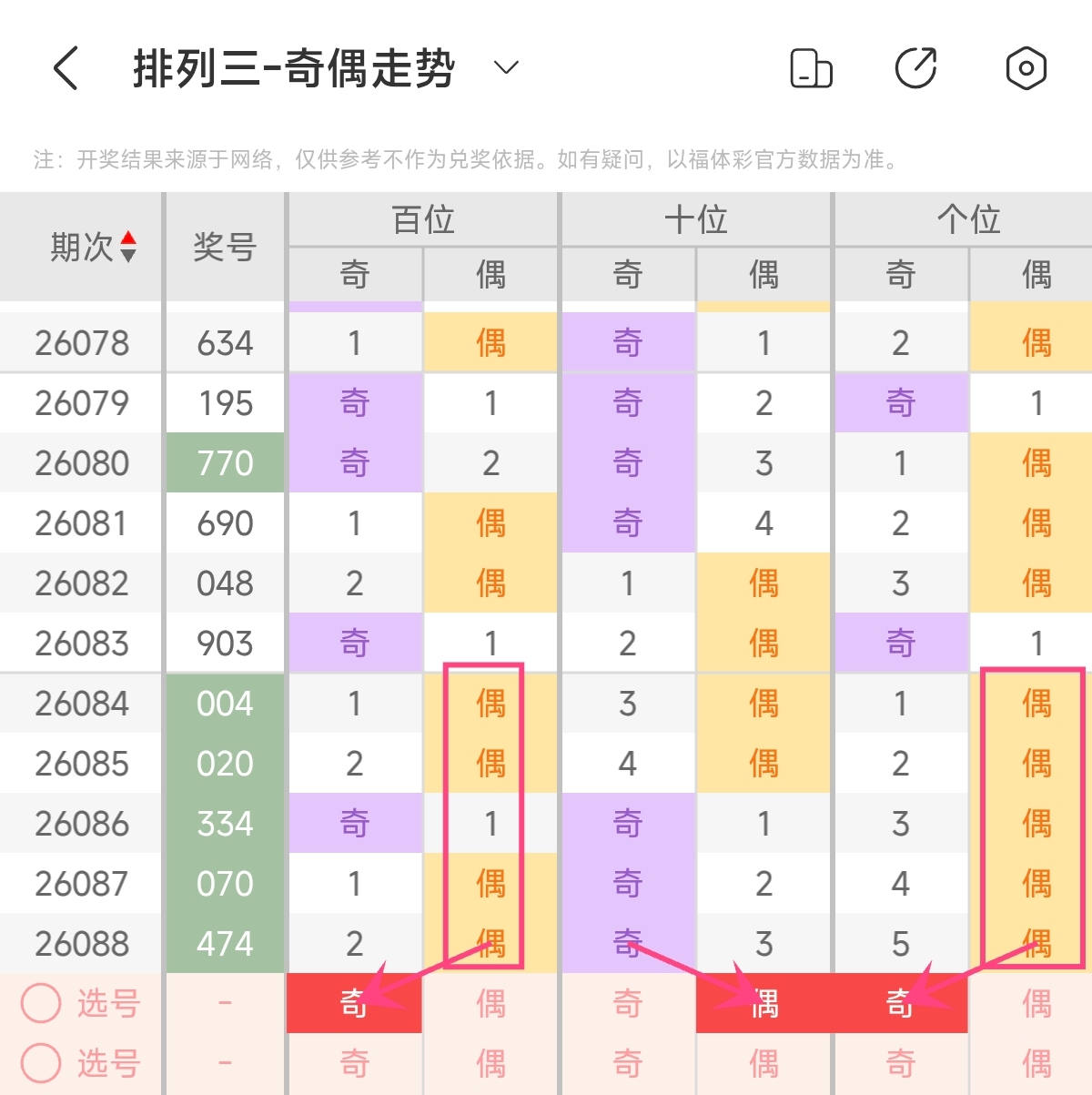 首先让我们回顾一下上期排列三第2026088期开奖号码为070,为组三形态,大小比为1:2,奇偶比为1:2,跨度为3,和值为15。