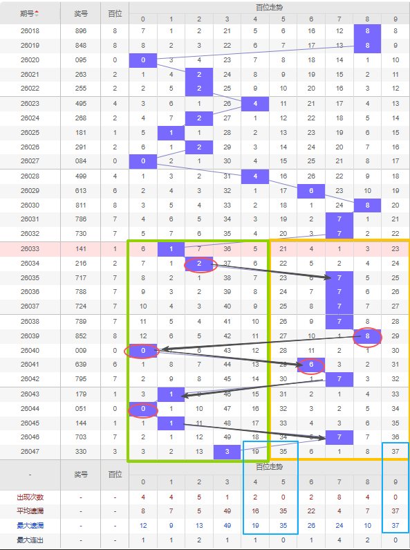 那么奇偶数方面:如图所示百位近15期开出奇数10期偶数5期,开出偶数的概率比开出奇数的概率小,近五期中四期都是开出了奇数号,那么本次考虑百位的趋势会逐渐增加偶数号,那么本期百位数看好偶数。偶数首先看好8号,上一次开出间隔了八期,本期若开出将形成8-8的形态。杀号建议定在奇数号,但是5号、9号都已经分别遗漏了35期和37期之久是百位遗漏期数最大的两个号,达到最大遗漏期数和平均遗漏数,建议开出防冷号开出。