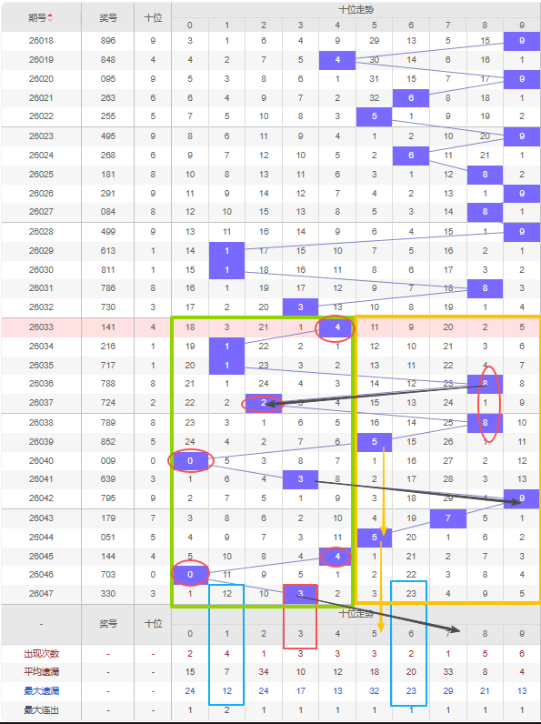 体彩排列3第2026048期的个位首先分析奇偶数号,如图所示近15期开出了9期奇数6期偶数,开出奇数概率比开出偶数概率的大,那么上期开出了偶数0号,在这之前 已经有过连续五期开出奇数号,那么如今考虑趋势将转为偶数,本期可以关注继续开出偶数号。偶数6号、8号都已经遗漏了十期以上,而且都达到了自身的最大遗漏期可以考虑防冷号开出。近二十期都只在26041期开出了一次重号,那么考虑重号将会开出,本期考虑上一期开出的0号防重号开出。杀号定在奇数号。