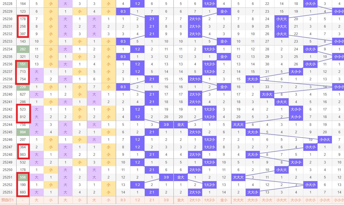 大小走势分析 在253期中,开奖号码为693偶奇奇形态;大小比为1:2,小数占据优势。回顾历史数据,发现大小比常常在短期内呈现波动,但长期趋于平衡。因此,在254期中,相信大小比将继续调整,倾向于保持大数优势。基于这一逻辑,预判254期的大小走势可能为“大中小”或“小中大,这样的组合不仅符合历史波动规律,也体现了当前大小比调整的趋势。