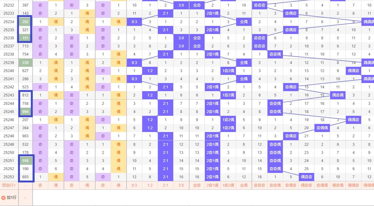 奇偶比例分析 253期的开奖号码为693奇偶比为2:1,奇数占据主导地位。在奇偶比例的分析中,同样注重平衡原则。考虑到近期奇偶比的波动,可以预判254期的奇偶比例将继续保持平衡,即可能为2:1或1:2。这样的预判不仅符合历史数据的统计规律,也体现了奇偶比例在短期内的调整趋势。