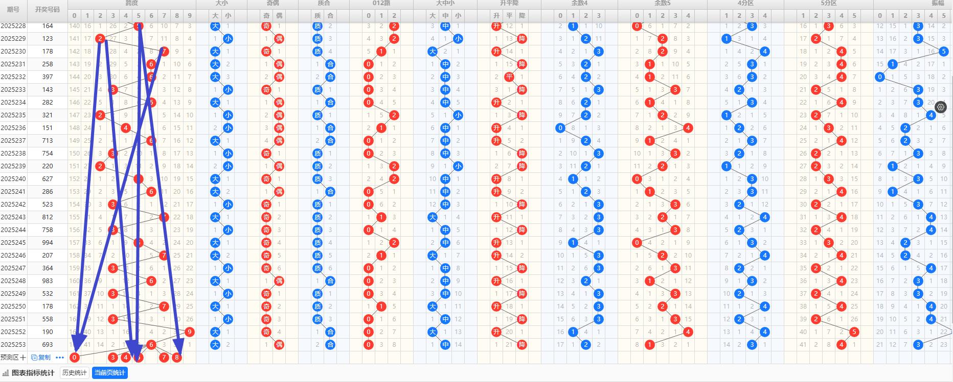 跨度预判 253期的开奖号码为693跨度为6,这是一个相对中等较大的跨度值。在跨度走势的分析中,注意到跨度值常常在短期内呈现跳跃性变化,但长期内趋于稳定。因此,在254期中,预判跨度值将在3到8之间波动,特别是不看好跨度2和9的出现。跨度预判为0、3、4、5、7.、8、近十期跨度值为3-5-7-3-6-3-7-3-9-6.;.012路 跨度比7:1:1...关注4、5、8的跨度。