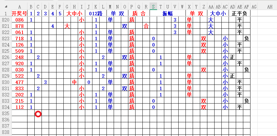 如上图7,012路分析-1路出号的概率还是很大,本期可以从1路号入手4代表78。