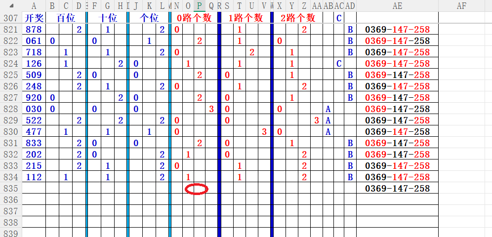 如上图56,012路分析0路出号的概率还是很大,本期可以从0路号入手做胆0369中选;看好369胆码。