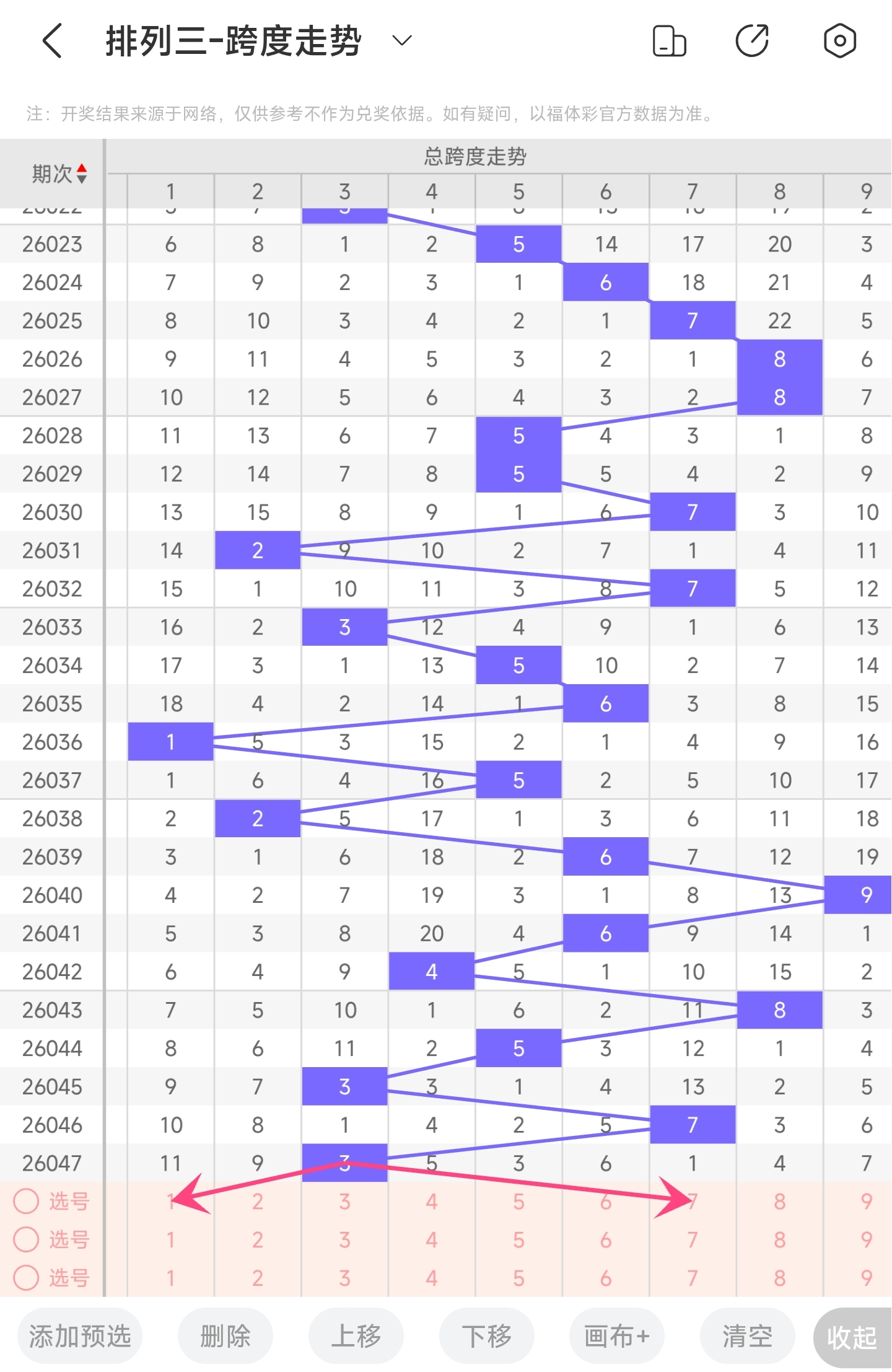 上期跨度为3,往前一期跨度是7,趋势往左移动,偏移量为4。跨度值3时,跨度值是近30期开出比较小的值。通过走势图分析,目前的趋势是大概率往右,小概率往左。所以推测本期跨度可能为25678等跨度。