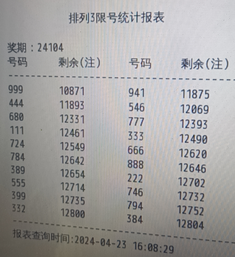 限号表统计报主要是反应当地已选号码最多的20组号码,也反应了当前那一部分太热,一般情况下当期限号表中的直选组合很难开出(豹子除外),也可以用当前限号表排除部分号码,限号表可能不同时间或者不同地区不一样,不过不影响大家看号,可以用这个表分析当前哪些号码热,哪些冷,原则上跟热码防守冷码,大热一般也是开不出来的,所以要冷热结合,偏重选热码,避开选号过热或者过冷。